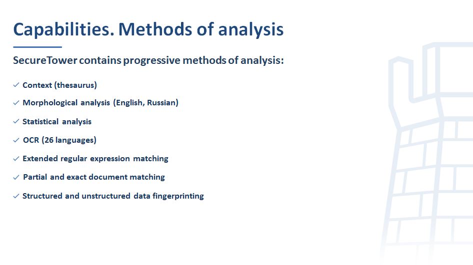 SecureTower provides control and prevention of file transfer to external media. The system performs automatic scanning of the documents, sent for printing or USB drive, for confidential information, and in case of detection of this information, notifies the administrator and allows to take preventive measures to remediate the incident.