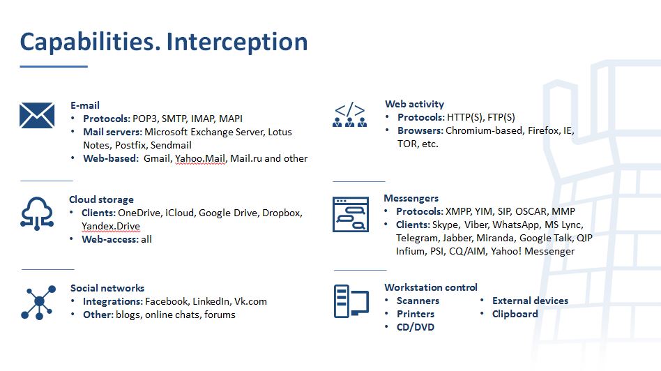 Employees of modern companies prefer to carry out business communication, using messengers and social networks, rather than by e-mail, with increasing frequency. To control these channels, the option of message and transferred file capture for practically all popular messengers is implemented in SecureTower. The DLP system can control instant messaging protocols OSCAR (ICQ/AIM), MMP (Mail.Ru Agent), XMPP (Jabber) (Miranda, Google Talk, QIP Infium, PSI), YIM (Yahoo! Messenger), SIP, as well as capture text and voice messages and files in Skype, Viber, MS Lync and Telegram.