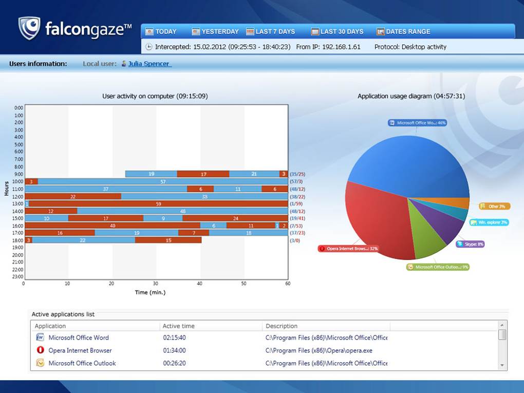 The DLP system tracks the applications, used by the employees throughout the working day. On the basis of the results, obtained by this option, you can check what applications were used by the employee more frequently and what period of time was devoted to the labour activities. Besides, the system can lock up particular applications, determined by the administrator.