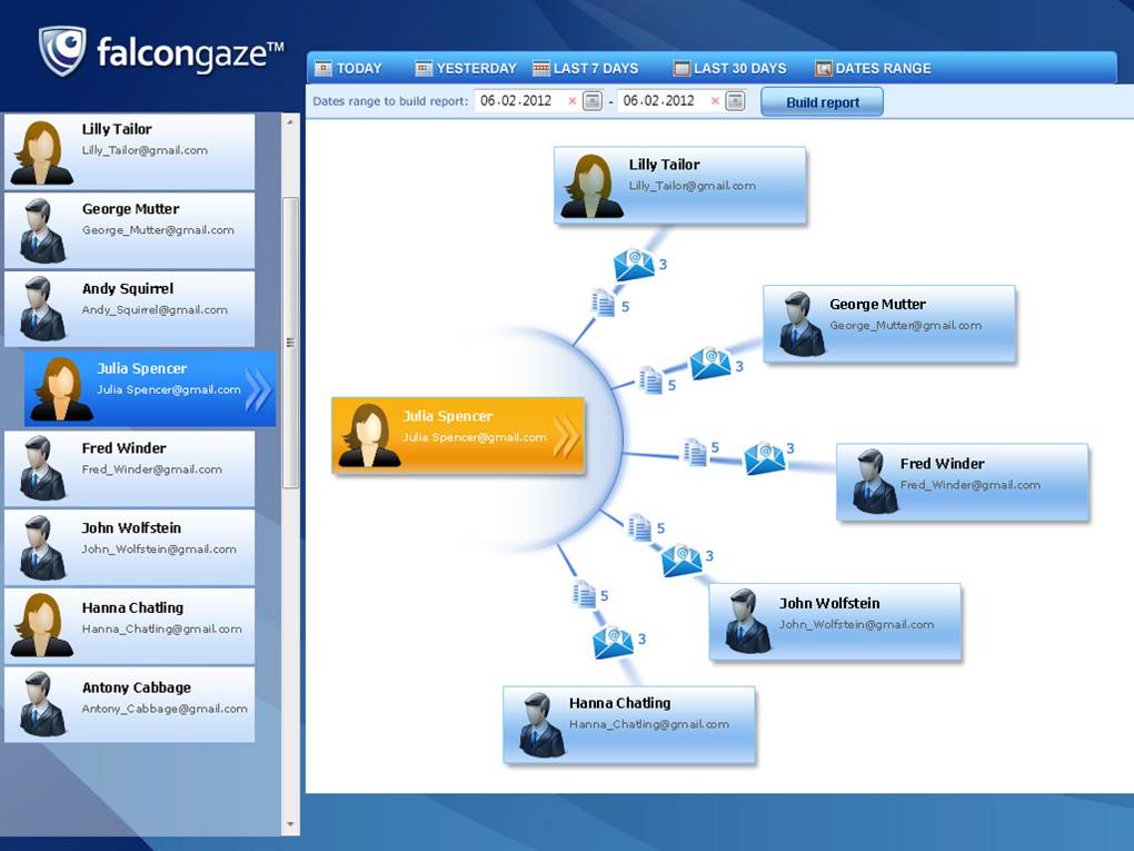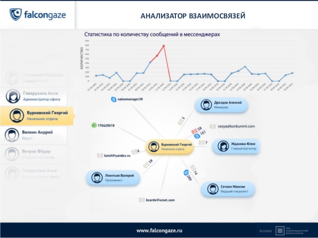 To detect the personnel interactions, SecureTower uses a graph analyzer, in which profiles, automatically linked to ActiveDirectory, are created for every employee, and displays the employee’s communication with other people. This profile shows the employee e-mail addresses, names in messengers, accounts in social networks an on other websites.